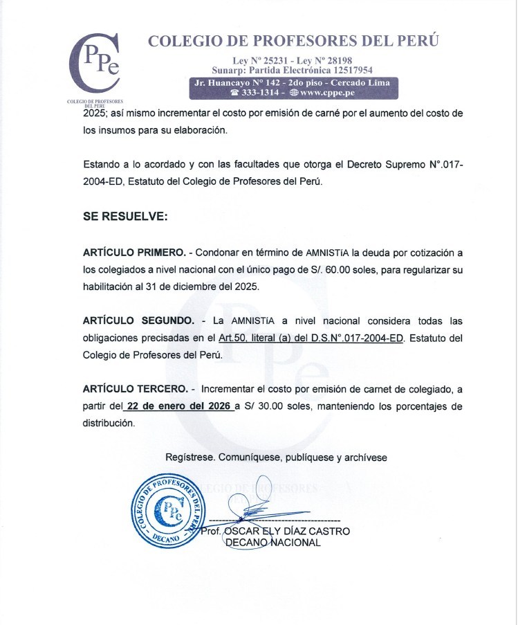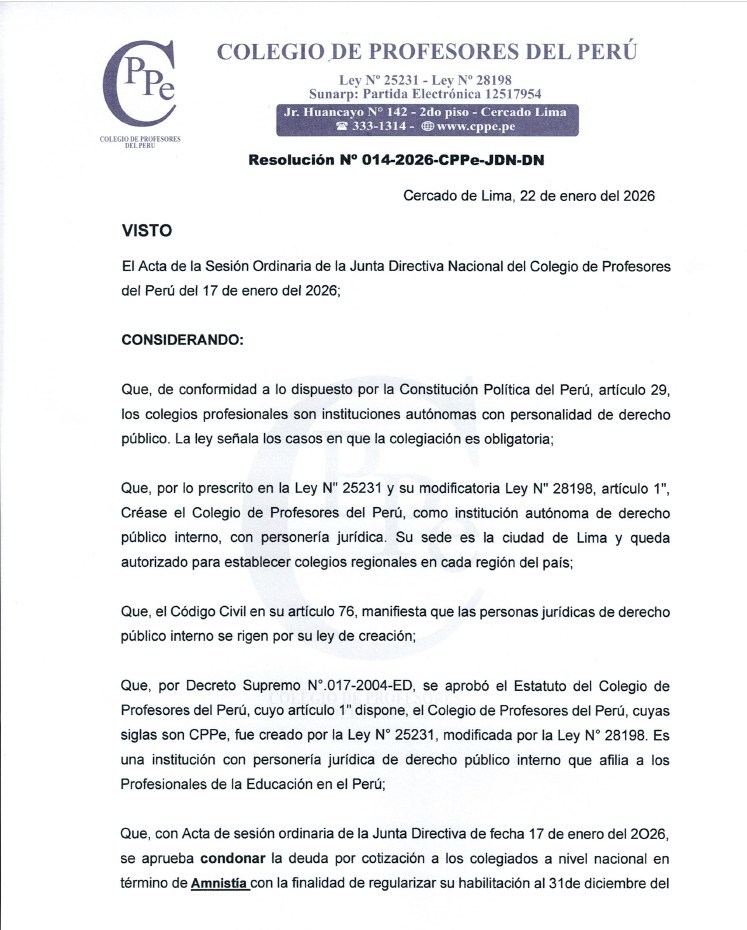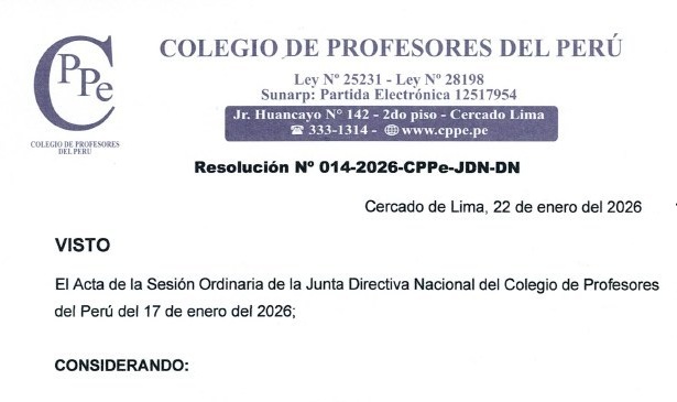 Lima, 23 de enero del 2026 1070 Publicaciones Sesión Ordinaria de la Junta Directiva CPPe – Resolución N°014-2026-CPPe-JDN-DN Volver
